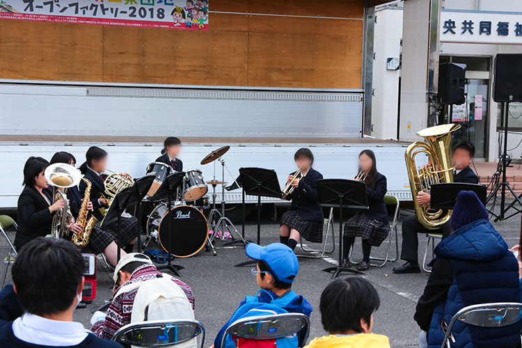 イベントブースに場所を移し、勝央工業団地オープンファクトリーも終盤です。高校生による吹奏楽の演奏が始まりました。